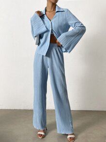SHEIN Essnce Bell Sleeve Plisse Shirt & Wide Leg Pants