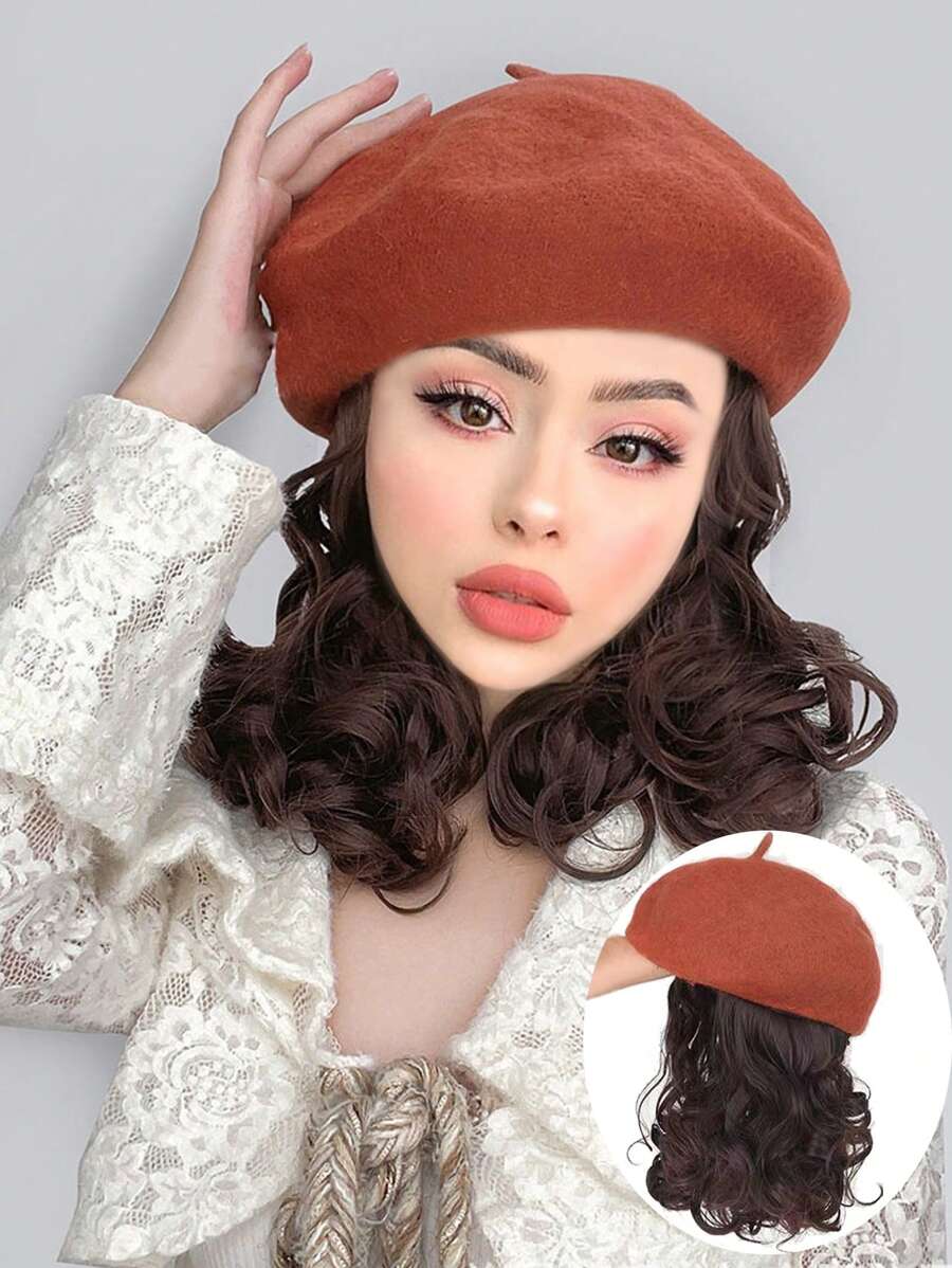 Beret with Hair Extensions for Women Hat with Kinky Curly Synthetic Wig Attached 13 inch Long Curly Hair Brick red Beret
