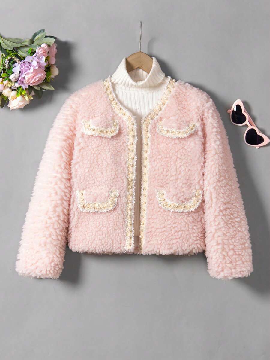 SHEIN Kids CHARMNG Tween Girls Pearl Web Decorated Short Teddy Jacket