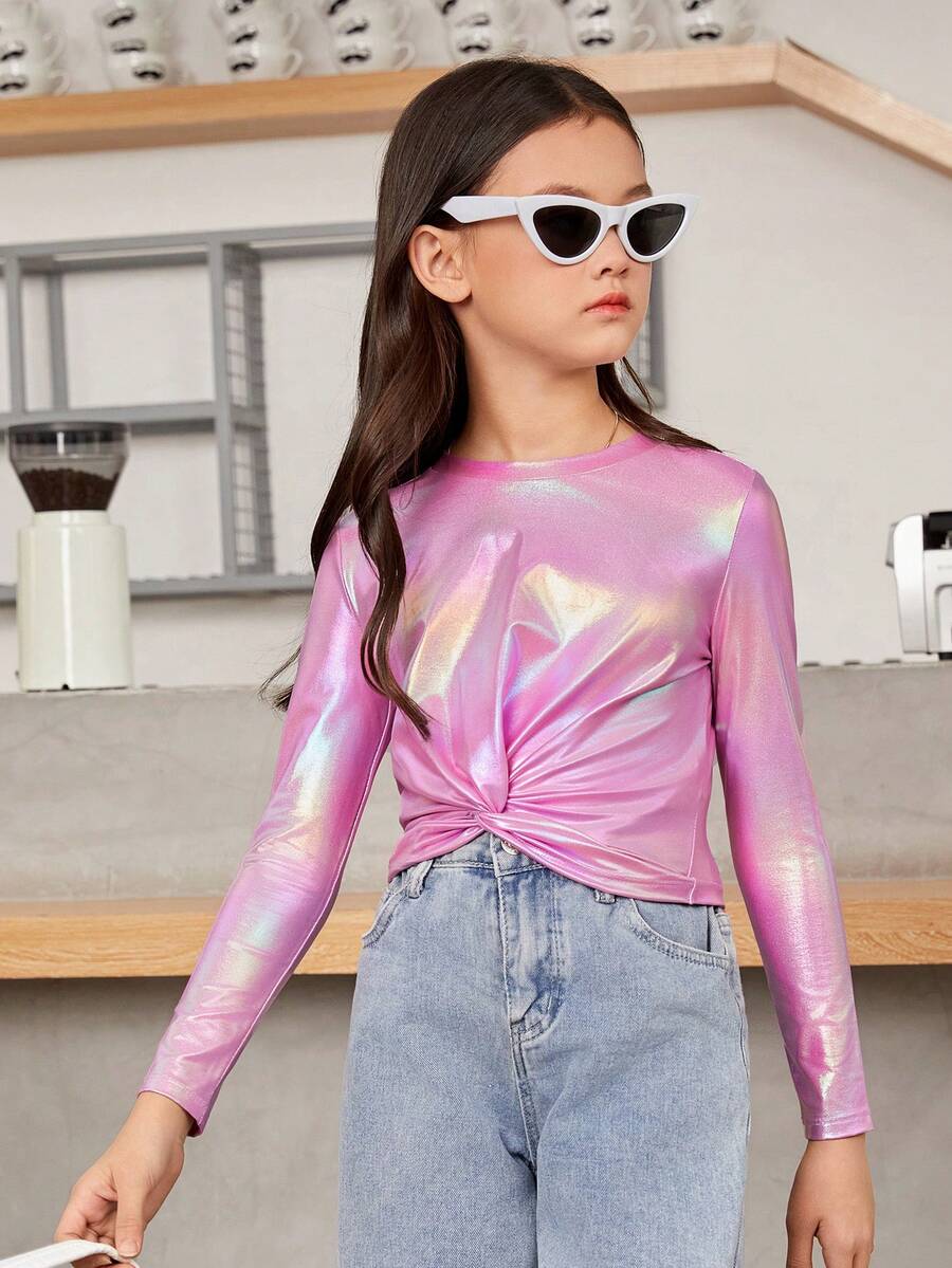 SHEIN Kids Y2Kool Big Girl Sweet Casual Fit Colorful Round Neck Long Sleeves