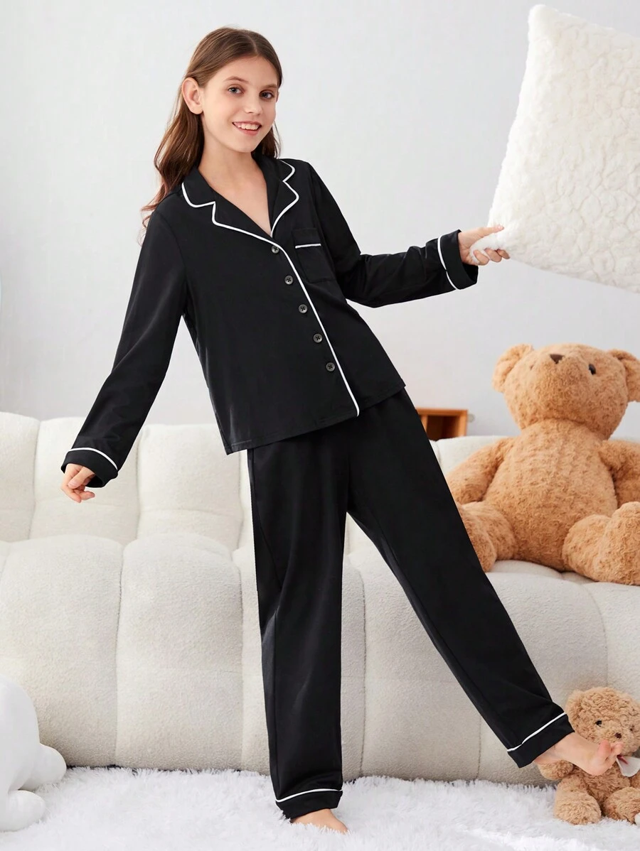 SHEIN Big Girls' Knitted Solid Color Lapel Loose Top And Wide Leg Pants Homewear Set
