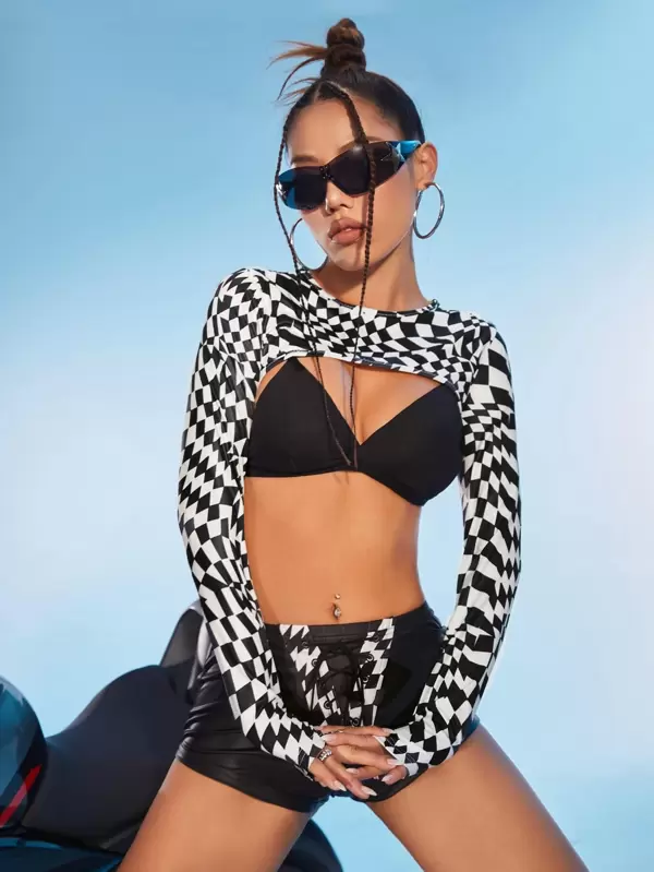 SHEIN ICON Bikercore Checkerboard Print Super Crop Shrug Top Without Bra
