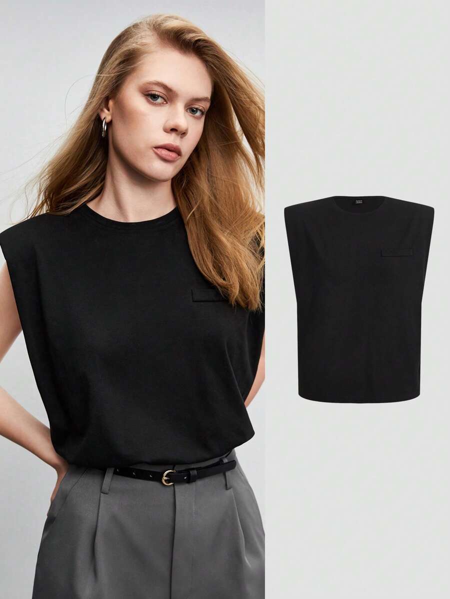 BizChic Women's Black Cotton Padded Shoulder Casual Vest Top, Loose Fit, Suitable For Urban Commute, Office, Business Casual, Party, And Other Occasions