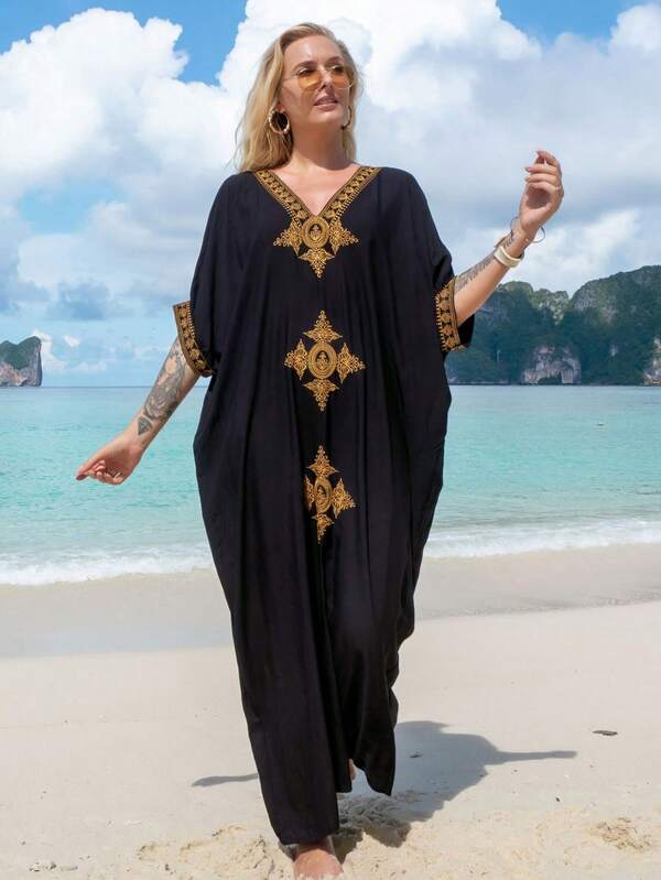 Black Embroidery Batwing Sleeve House Caftan Dress