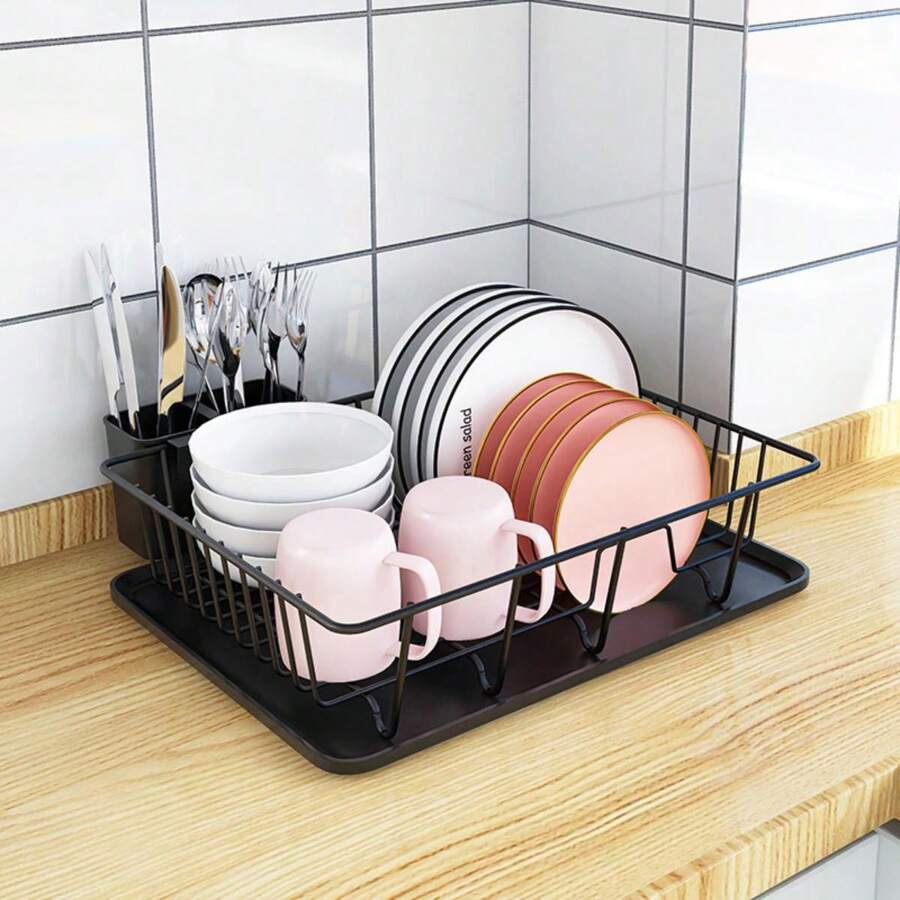 Black Modern Simple Kitchen Storage Rack, Single Layer Dish & Cutlery Organizer For Sink Or Cabinet, Plate Rack, Water Drainage Container For Easty Cleaning, Rust-Proof & Durable With Paint Process, Knife, Fork, Spoon Holder, Detachable With Bottom Drain Hose