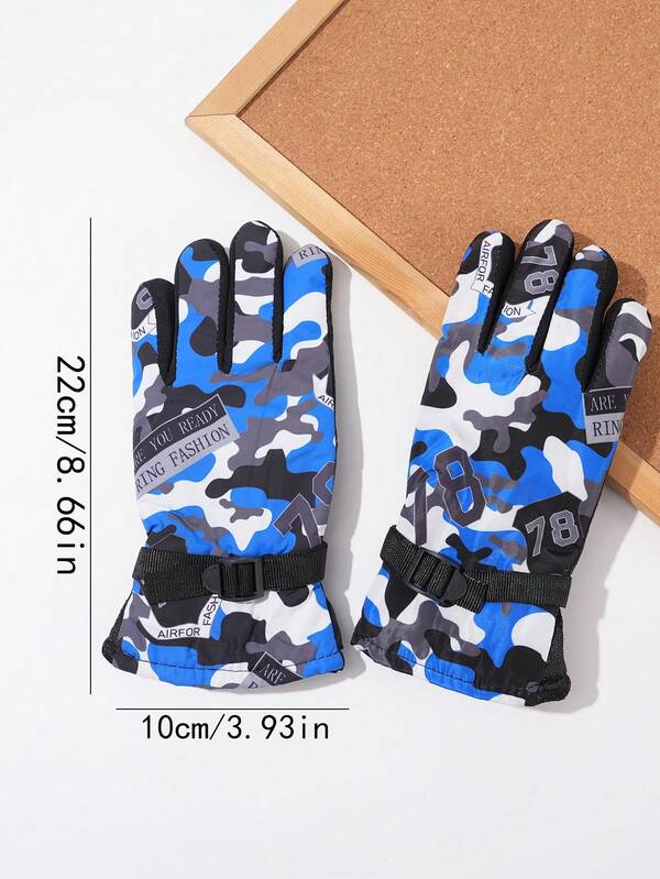 Blue Autumn/Winter Children Windproof Fashion Gloves For Boys And Girls, Camouflage Skiing Thick Warm Plush Gloves