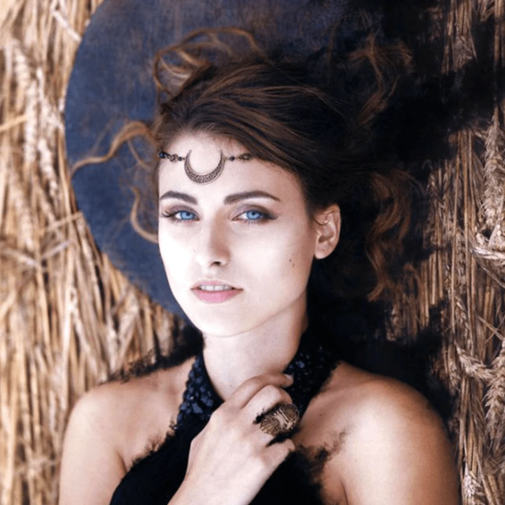 Boho Style Hollow Out Moon Pattern Head Chain With Natural Stone Crystal Beads Hair Jewelry, Antique Bronze & Black Crystal