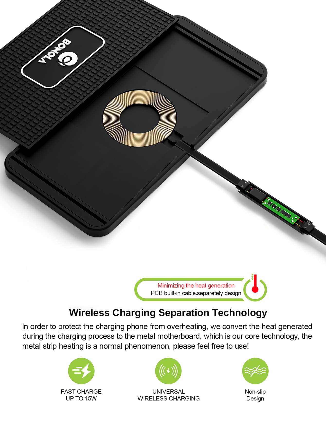 Bonola Car wireless charger silicone anti-slip pad High efficiency induction Compatible With iPhone12/13/14/8/X/XR/Samsung/Xiaomi11 15W wireless fast charging