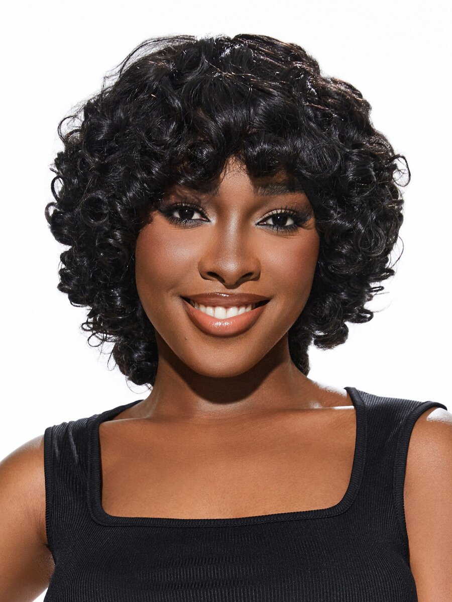 Bouncy Curly Short Hair Pixie Cut Machine Made Wig With Bang Natural Black Human Hair For Woman Top Quality Wear To Go