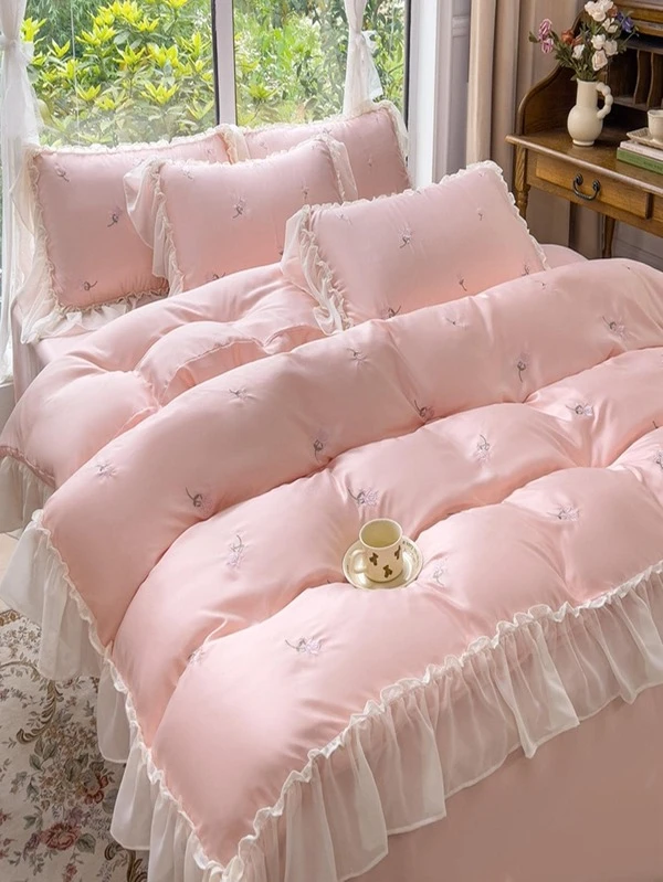 Bow Embroidered Ruffle Trim Duvet Cover Set Without Filler
