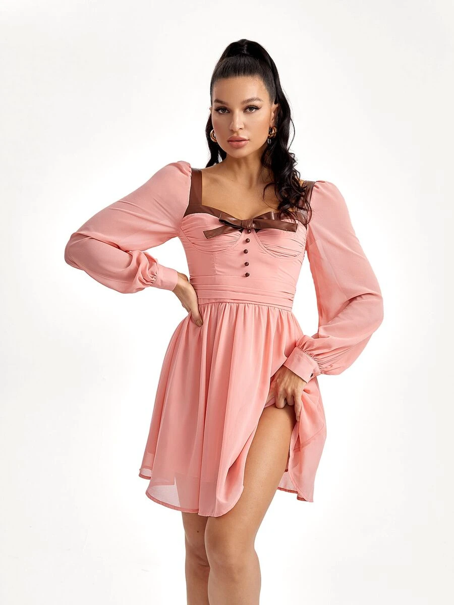 Koukla Bow Front Sweetheart Neck Lantern Sleeve Dress