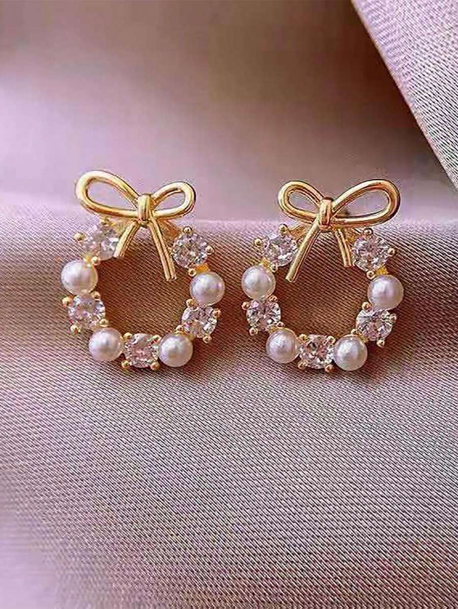 Bow Knot Imitation Pearl Earrings And Earrings