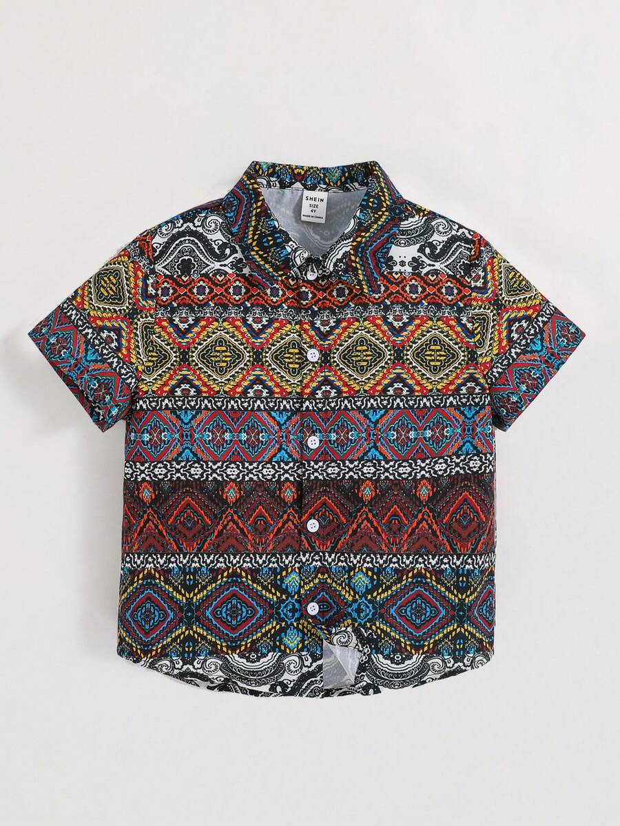 SHEIN Kids SUNSHNE Boys' Casual, Comfortable, Stylish, Simple, Practical, Versatile, Retro Geometry Patterned, Breathable, Short Sleeve Shirt, Suitable For Spring And Summer