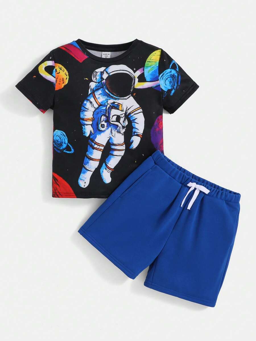 SHEIN Boys' Casual Comfortable Astronaut Pattern Short Sleeve Top And Shorts Set