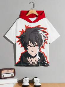 SHEIN Boys' Casual Contrast Color Cap Short Sleeve Knit T-Shirt With Cartoon Printed Patterns, Hat Included