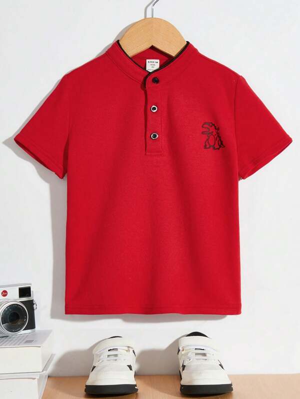SHEIN Kids QTFun Young Boy Cute And Comfortable Dinosaur Pattern Short Sleeve Shirt With Stand Collar And Half Button-Up