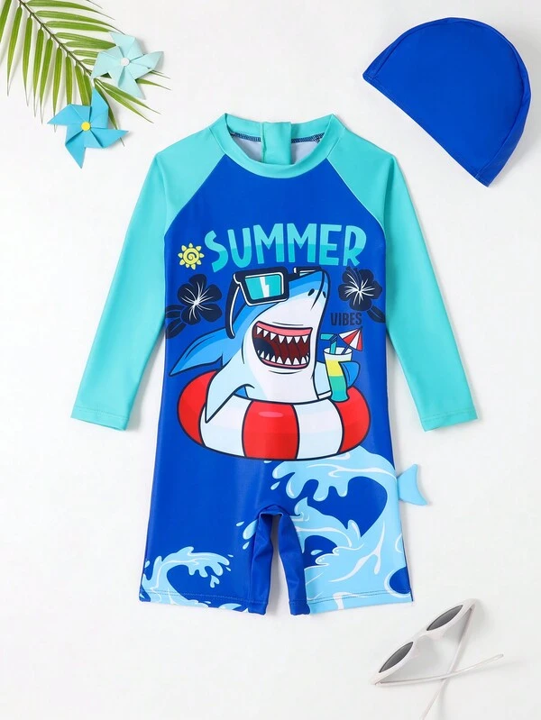 Boys' Cute Letter & Shark Print One-Piece Swimsuit With Swimming Cap