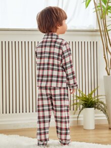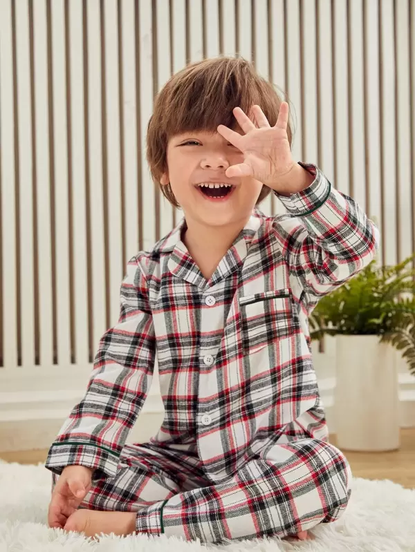 Boys' Grid Print Long Sleeve Shirt With Pocket Detailing & Long Pants Pajama Set