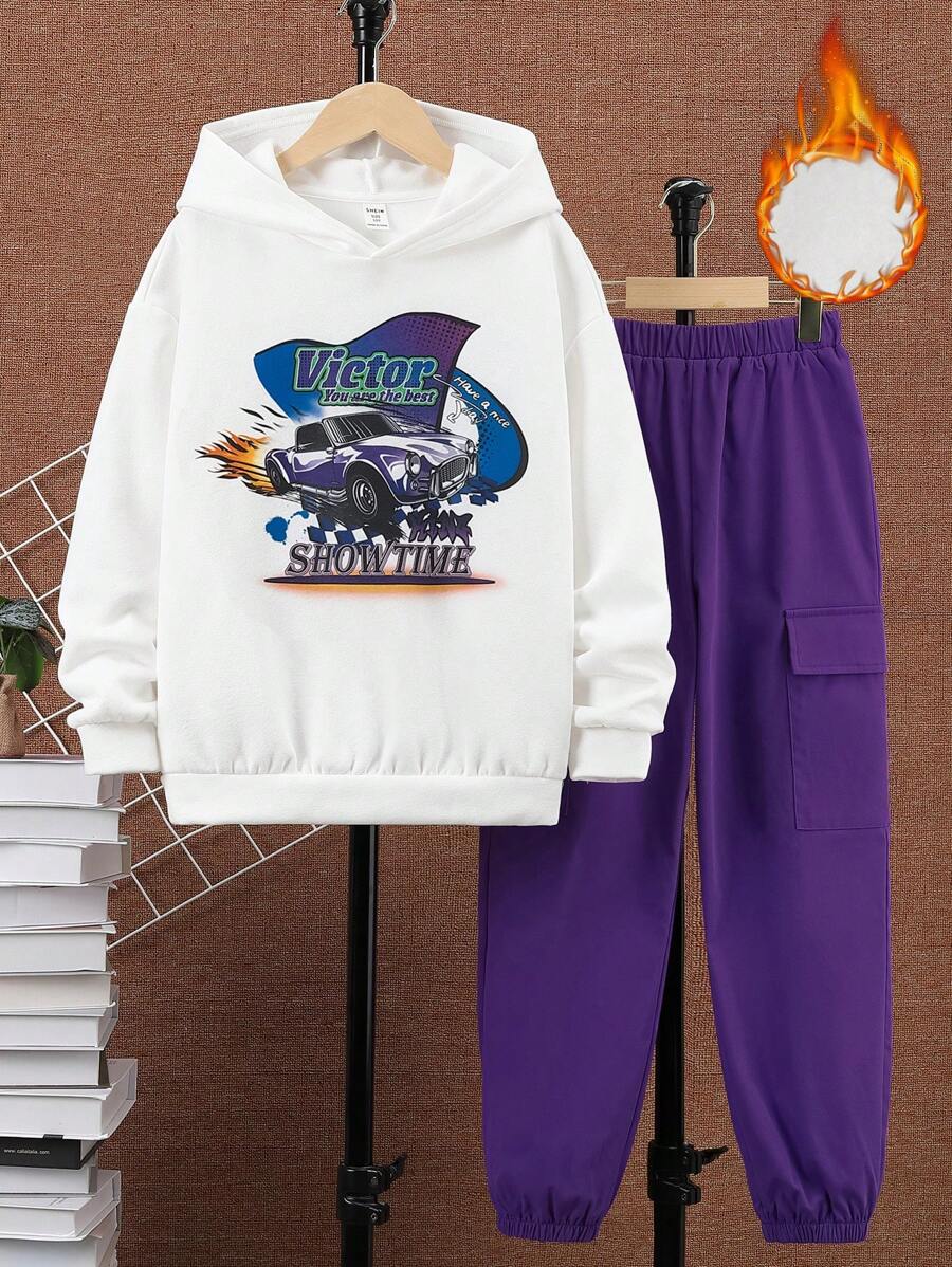 SHEIN Boys' Loose Fit Sports Hoodie With Letter & Car Pattern And Solid Color Sweatpants With Fuzzy Lining Two-piece Set