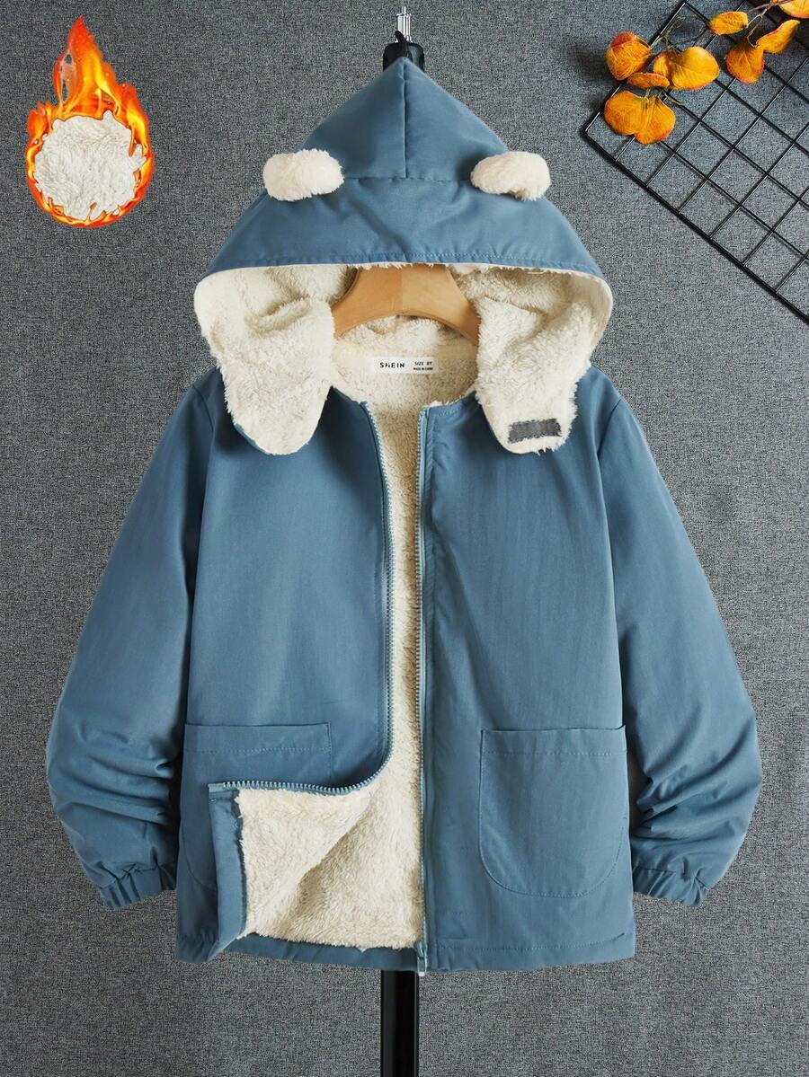 SHEIN Boys' Plush Lined Hooded Loose Fit Comfortable Jacket, Winter