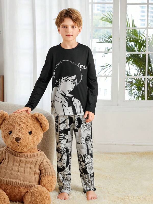 SHEIN Boys' Round Neck Cartoon Character Print T-shirt And Long Pants Homewear Set