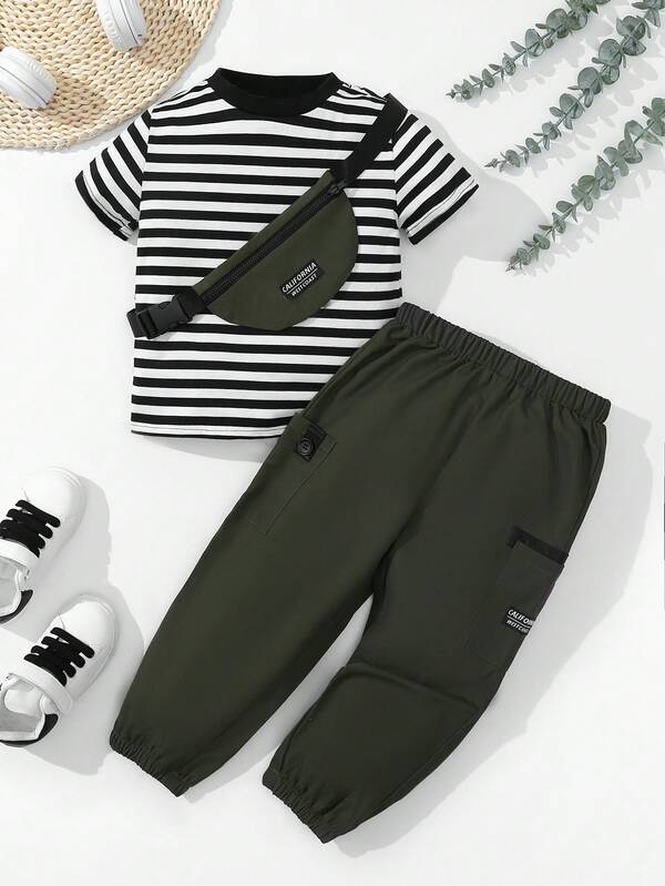 SHEIN Kids EVRYDAY Boys' Slim Fit Striped T-Shirt And Long Pants Set, Casual