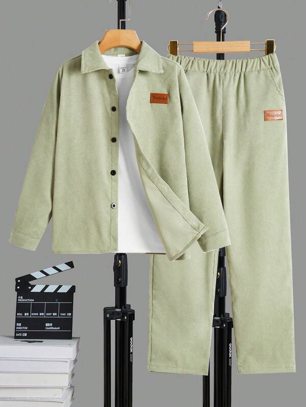 SHEIN Boys' Solid Color Cardigan With Lapel Collar And Matching Pants Set