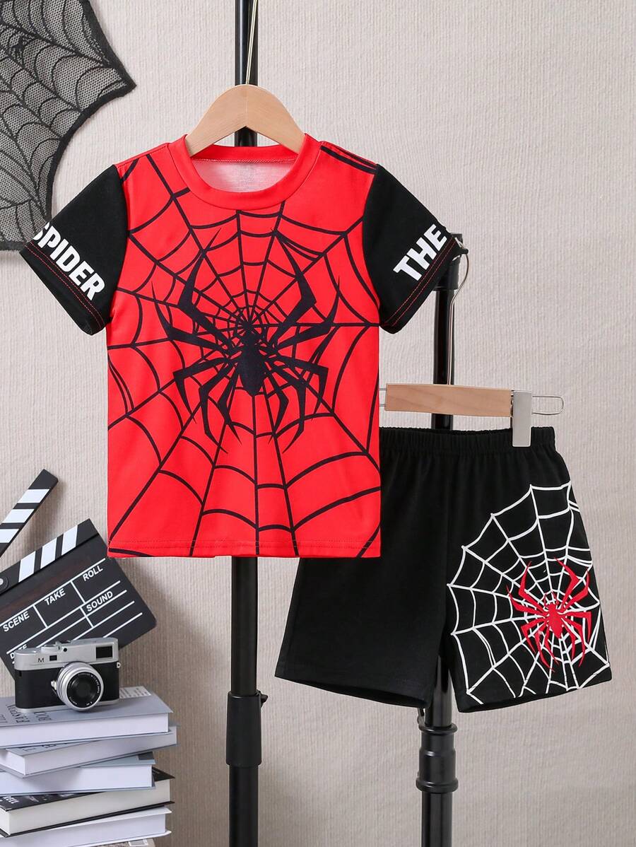 SHEIN Young Boy Spider Pattern Short Sleeve T-Shirt And Shorts Set