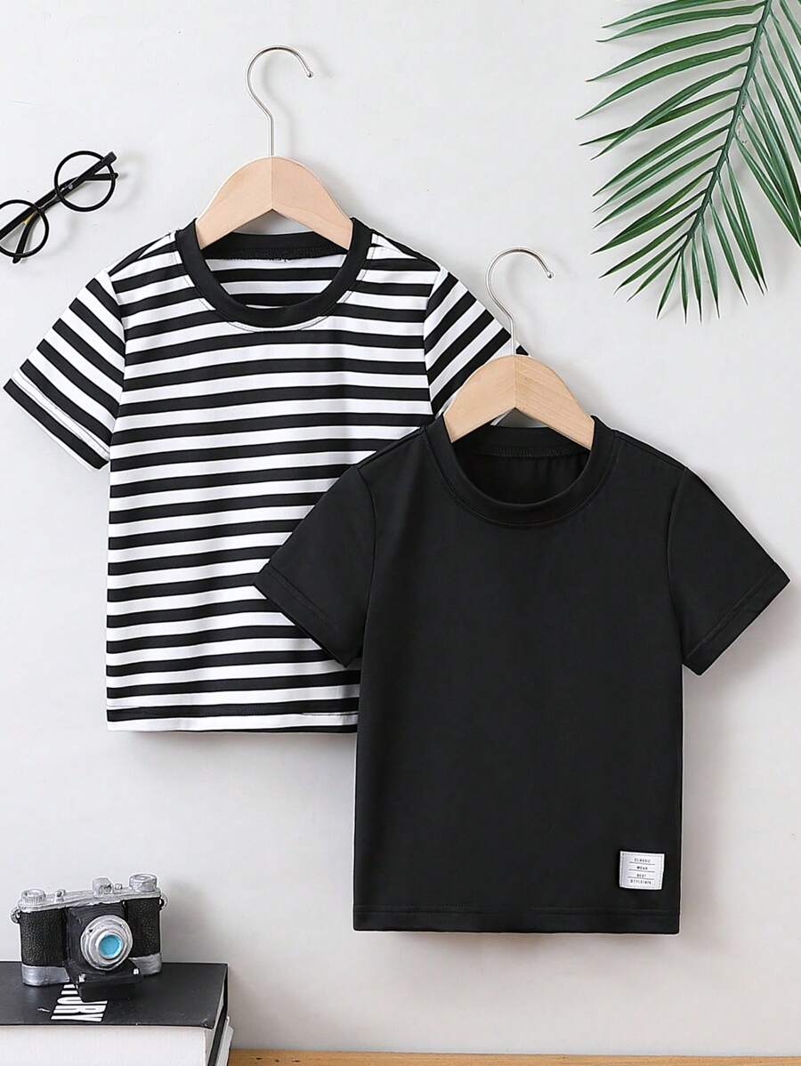 SHEIN Kids EVRYDAY Boys' Striped Short-Sleeved T-Shirts And Solid Color Short-Sleeved T-Shirts