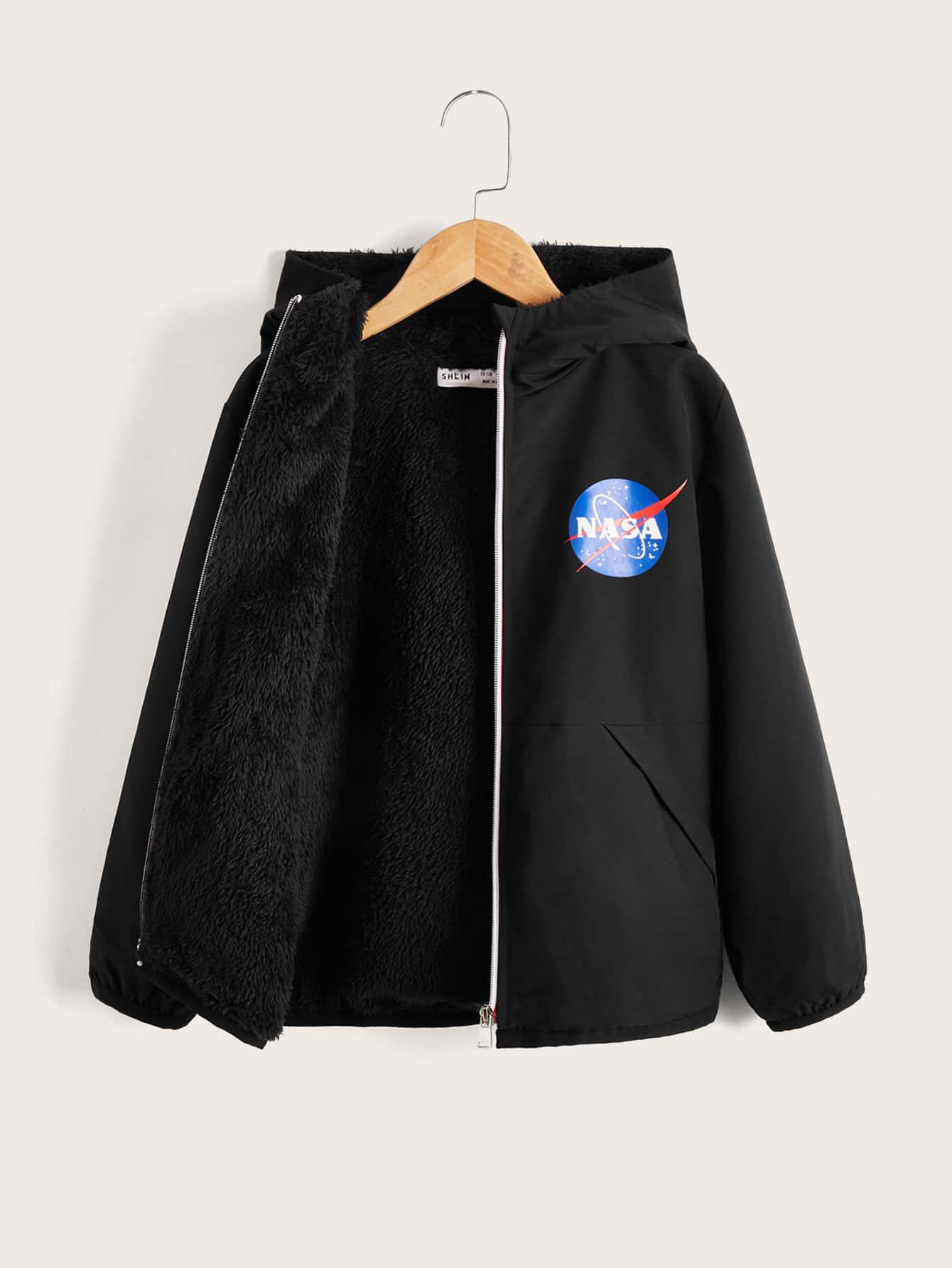 SHEIN Boys Letter & Logo Print Zipper Hooded Teddy Lined Jacket