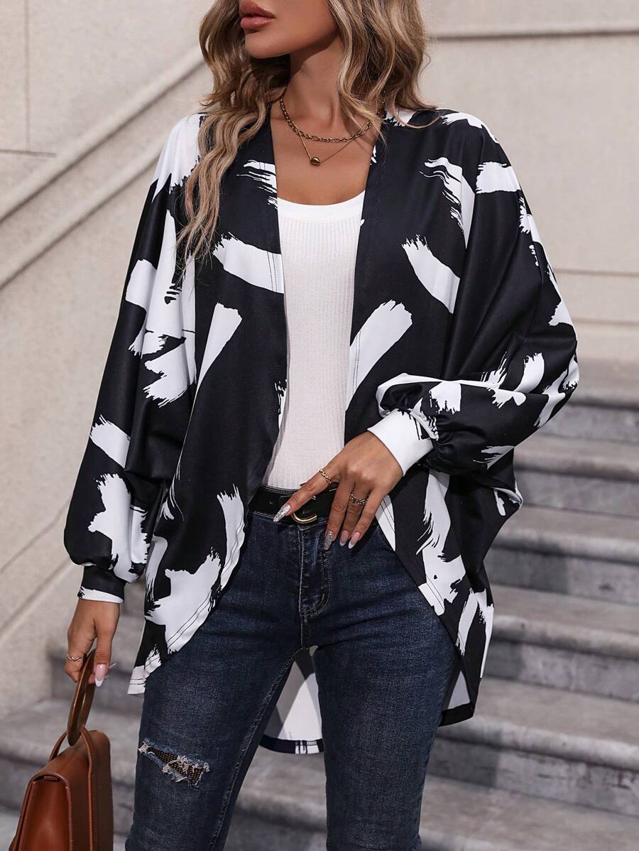 Brush Print Batwing Sleeve Open Front Coat