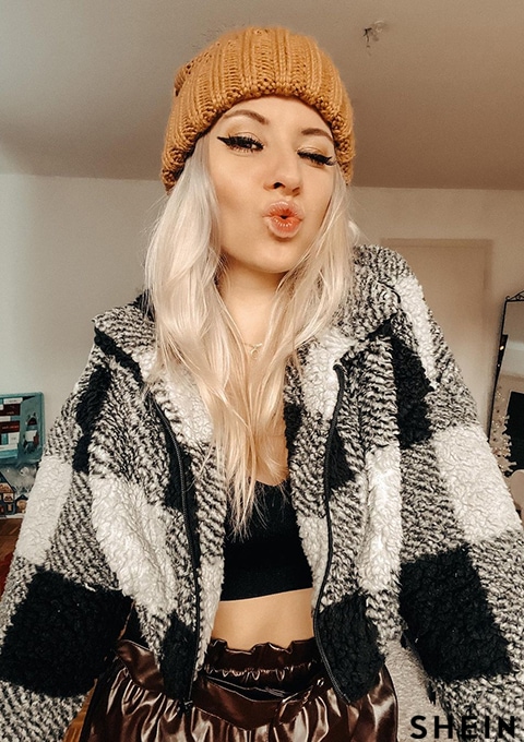SHEIN Essnce Buffalo Plaid Pattern Drop Shoulder Teddy Jacket