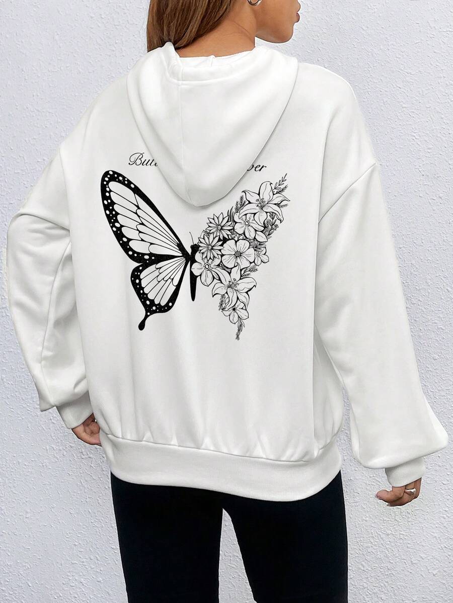 SHEIN EZwear Butterfly & Flower Print Loose Hoodie