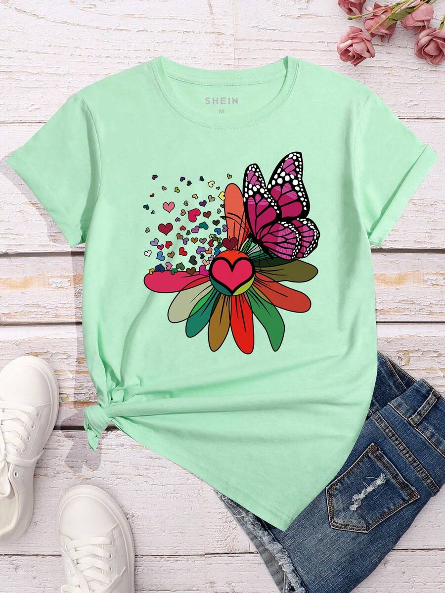SHEIN Essnce Butterfly And Floral Print Short-Sleeved T-Shirt