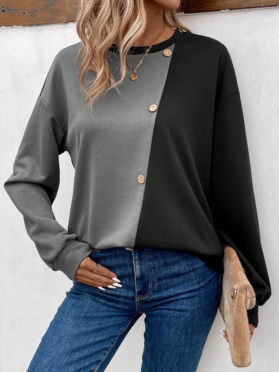 SHEIN LUNE Button Decorated Color Contrast Sweatshirt