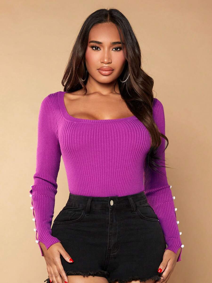 SHEIN SXY Button Detail Square Neck Ribbed Knit Sweater