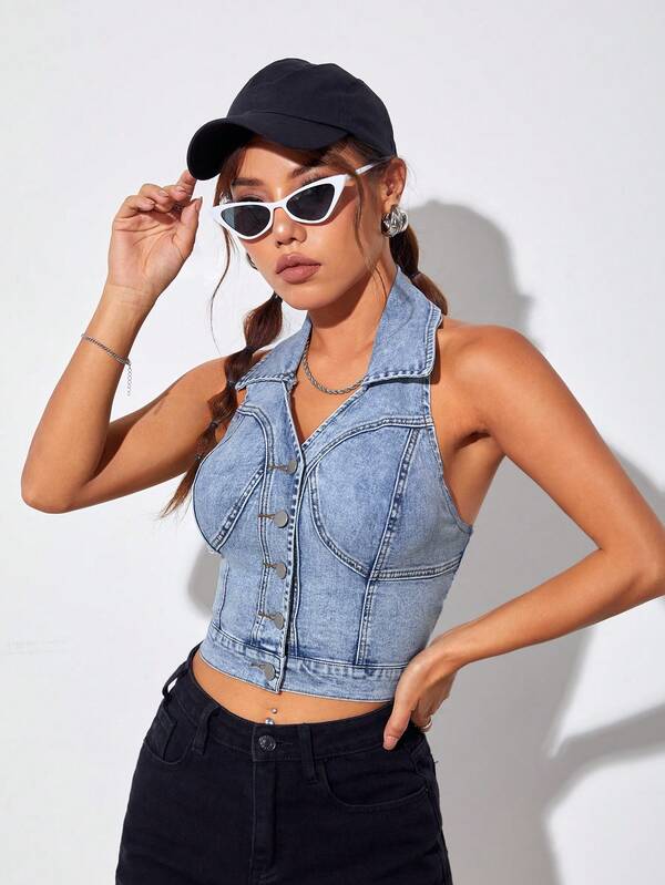 SHEIN EZwear Button Front Halter Neck Denim Top