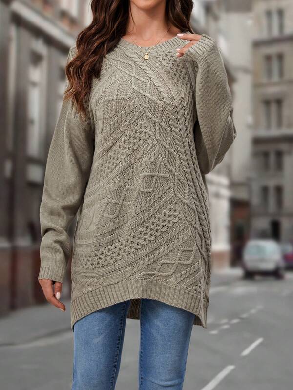 EMERY ROSE Cable Knit Drop Shoulder Asymmetrical Hem Sweater