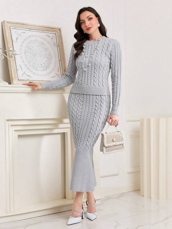 SHEIN Modely Cable Knit Sweater & Mermaid Hem Knit Skirt