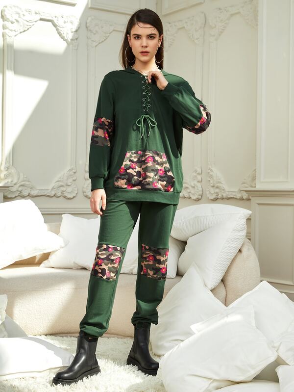 IMperfect Camo and Floral Print Panel Lace Up Hoodie