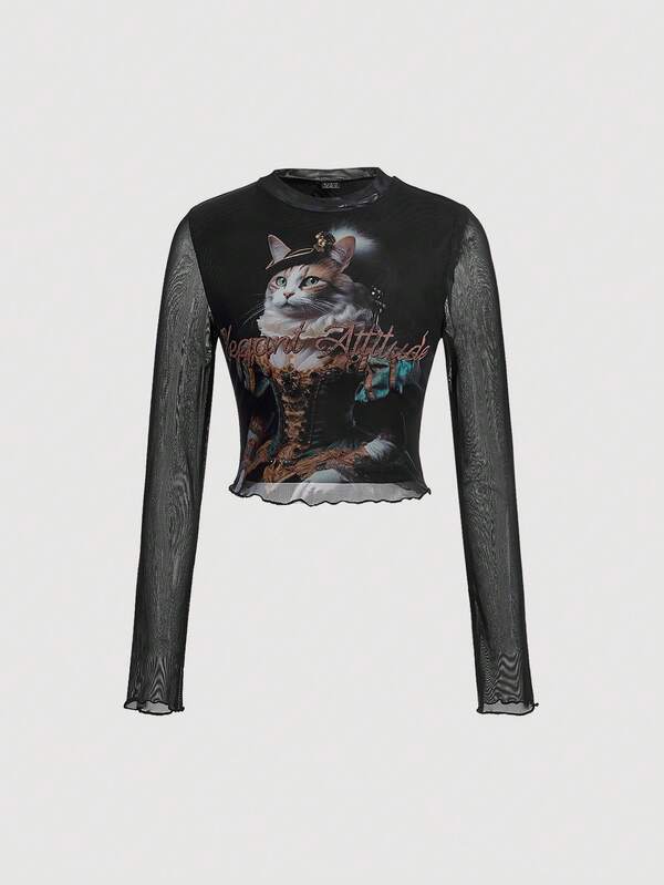 SHEIN MOD Cartoon & Letter Graphic Lettuce Trim Crop Tee