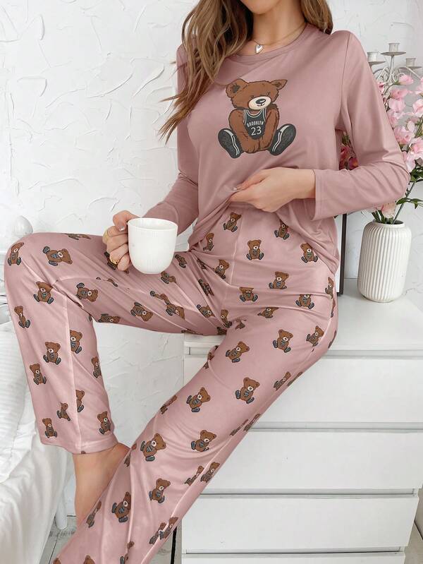 Cartoon Bear Printed Long Sleeve & Long Pants Pajama Set