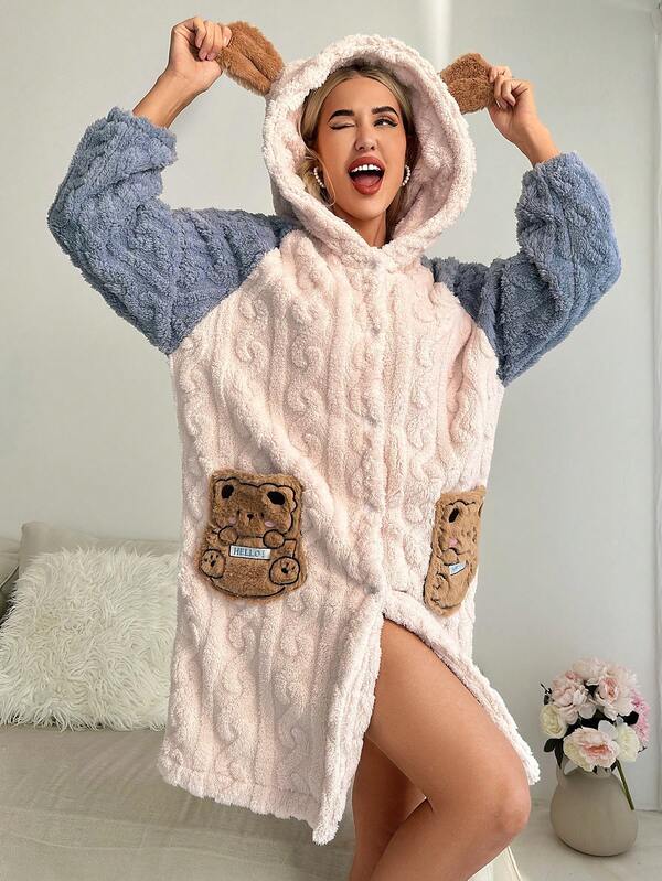 Cartoon Embroidery Raglan Sleeve 3D Ear Design Hooded Sleep Robe