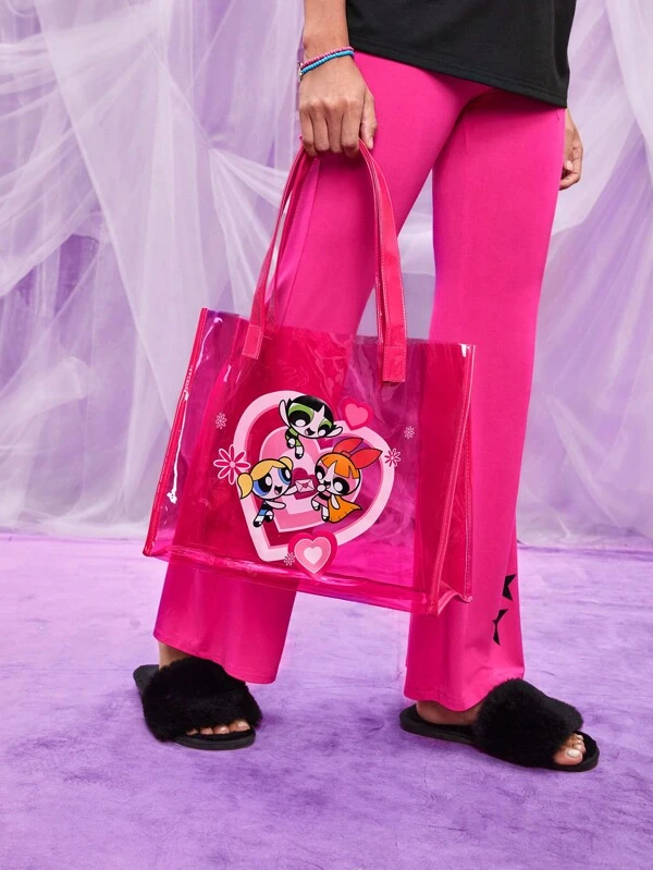 THE POWERPUFF GIRLS X SHEIN Cartoon Pattern Shoulder Tote Bag Pink PVC Double Handle