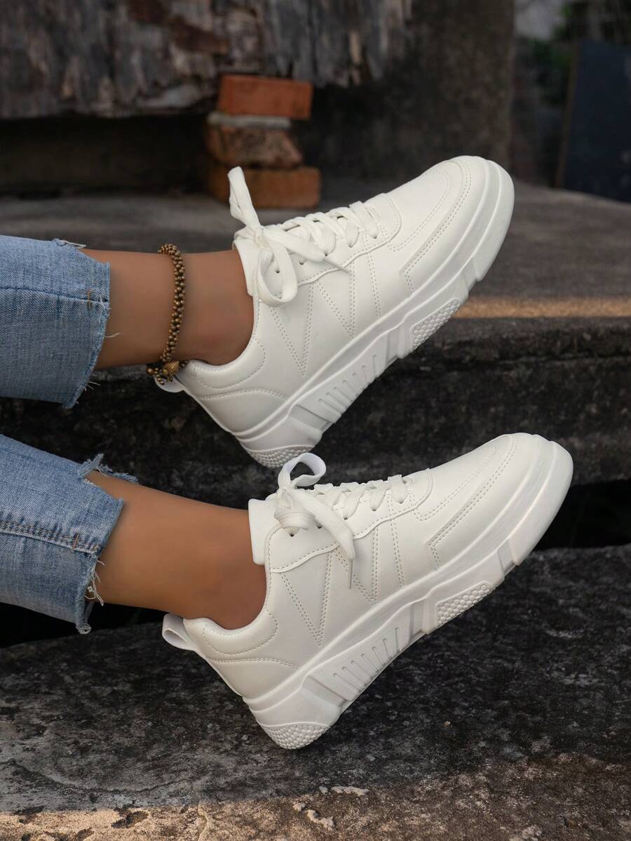 Casual Flat Skate Shoes Anti-slip Women's Fashionable Breathable White Trainers With Thick Sole