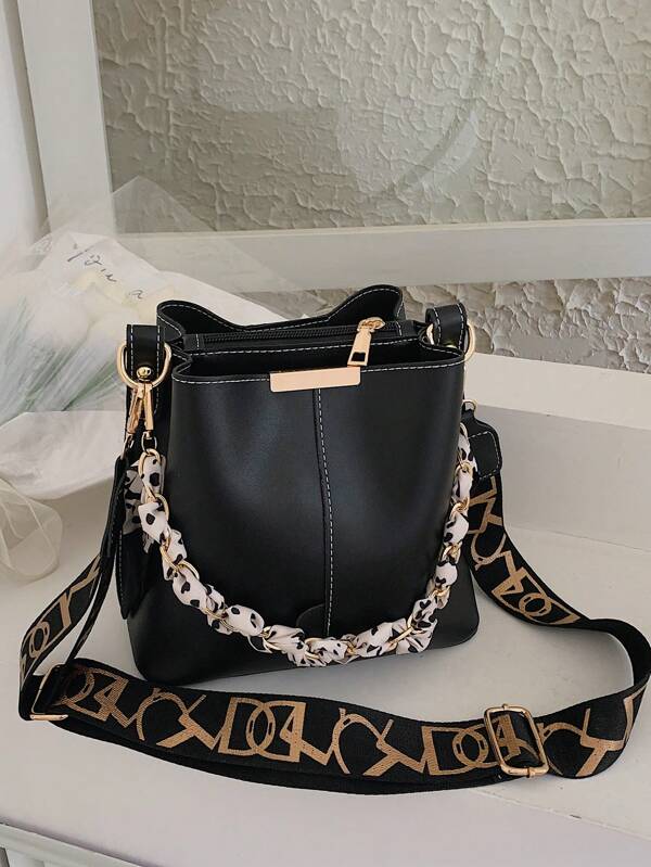 Chain Decor Bucket Bag Small Twilly Scarf Decor