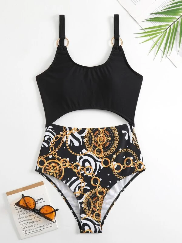 Chain Print Cut Out Ring Linked One Piece Swimsuit