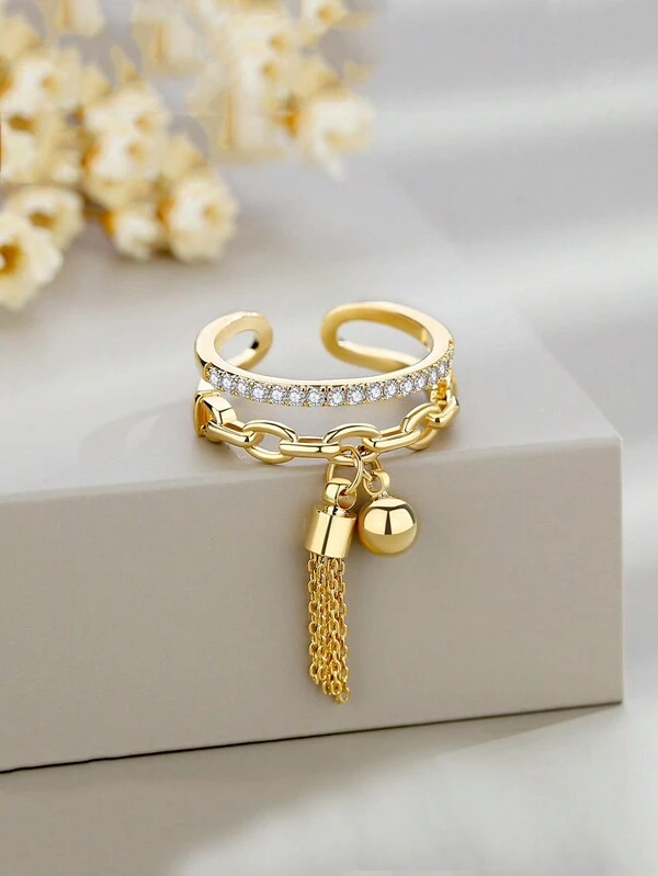 Chain Tassel & Ball Charm Rhinestone Decor Cuff Ring