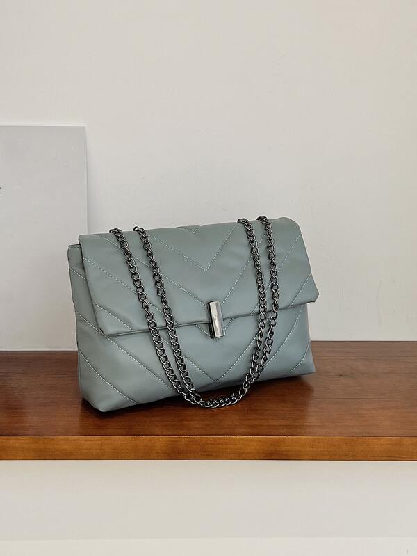 Chevron Chain Flap Square Bag, Daily commuting, travel, vacation, street shopping, solid color twist-lock metal chain, quilted PU material metal chain, quilted