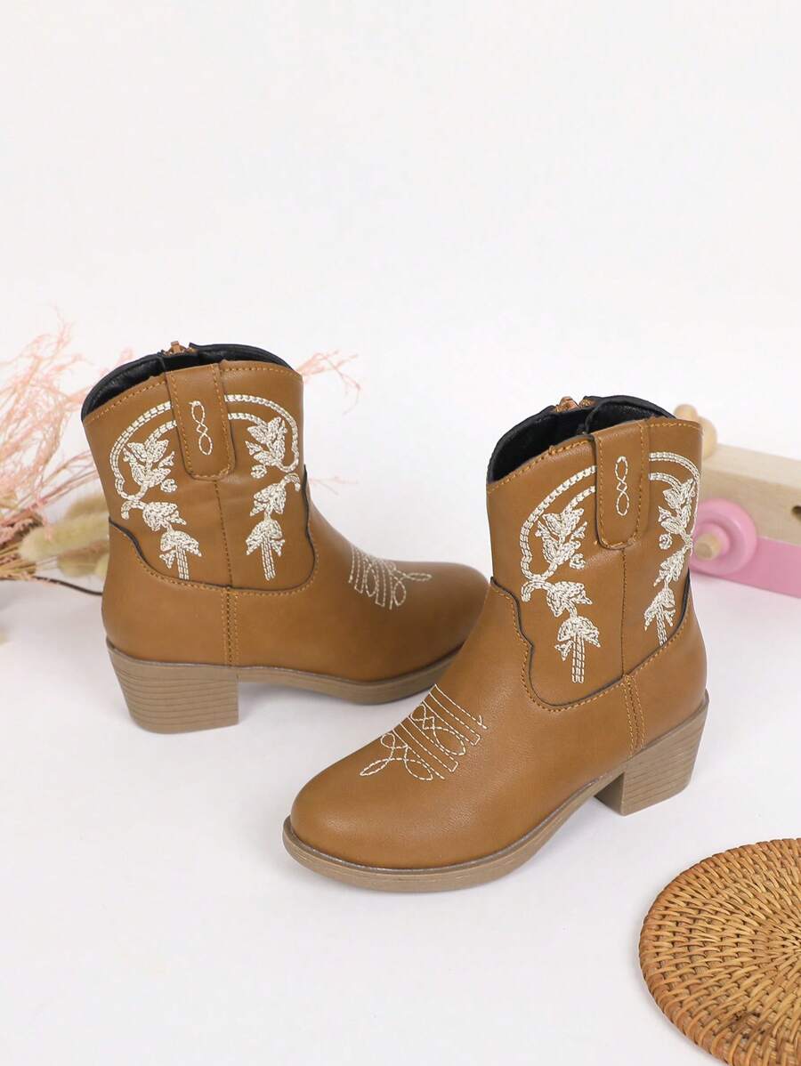 Children's Boots For Girls, High-top, Mid-top, Embroidered High Heels, Western Cowboy Boots, Pointed Toe, Side Zipper
